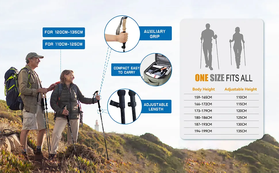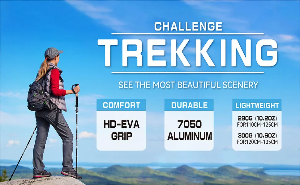 【Lightwight & Portable】 These hiking poles are crafted with strong aircraft-grade 7075 aluminum, tougher than carbon fiber, yet weigh almost 4oz less than your average trekking poles for hiking. Fitting into backpack, luggage cases, or duffel bags for compact travel!