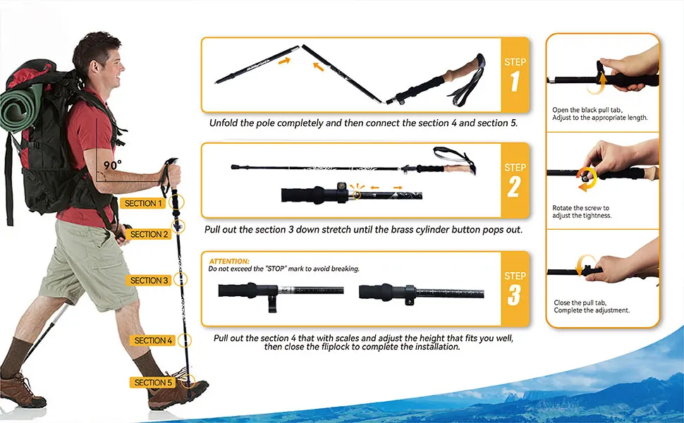 【Ease of use】 Our lever locks can be easily operated with just one hand, which is much easier than the 2-handed twist locks on other walking sticks for hiking.The padded straps and moisture-wicking cork handles will mold to the shape of your hand for a comfortable grip on each walking stick. The water-proof carrying bag allows you to easily pack and carry the poles.